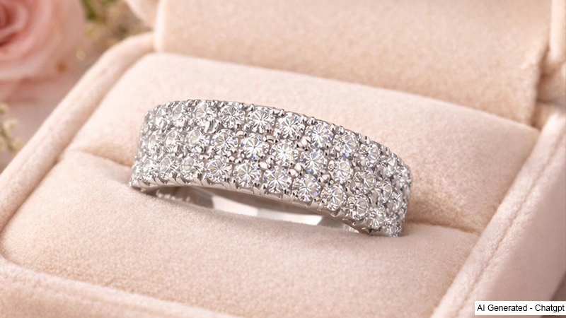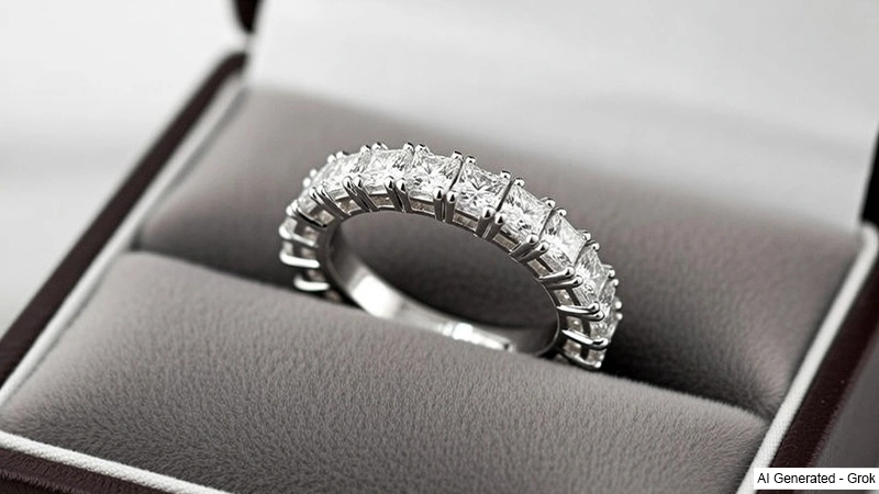 For the bride who believes in more sparkle, this three-fourth eternity wedding ring boasts 2.25 carats of diamonds set in platinum. Priced at $5,082, it’s an opulent masterpiece that commands attention. Style it with a bold solitaire, like Hailey Bieber’s radiant oval diamond, or pair it alongside a showstopper emerald-cut ring, like Beyoncé’s iconic sparkler. This band stacks beautifully, adding layers of luxury and making your wedding day look unforgettable.