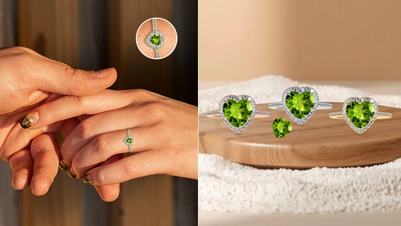 Add extra brilliance to your August birthstone jewelry collection with a radiant peridot ring. Make your loved one’s birthday more special and romantic- propose her with a heart-shaped or oval peridot ring. Additionally, for those who want something artistic and classic, vintage-inspired halo rings with diamond accents make a perfect choice for timeless charm.