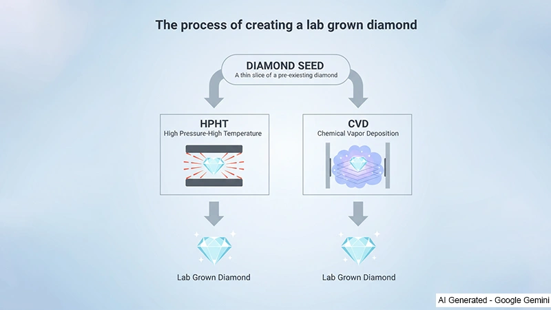 Lab diamonds are created within controlled environments where scientists mimic the natural conditions under which natural diamonds are formed. This includes compressing carbon atoms under extreme temperatures and pressure. The result leads to a chemical, physical and optical identical twin of a natural diamond.
