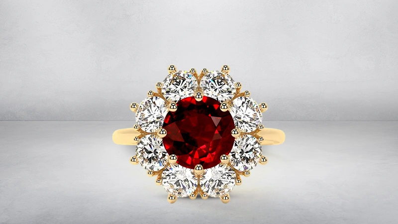It is a ring style that surrounds a center stone with a circle of smaller stones. It is influenced by the geometric, symmetrical, and glamorous designs of the 1920s Art Deco era.