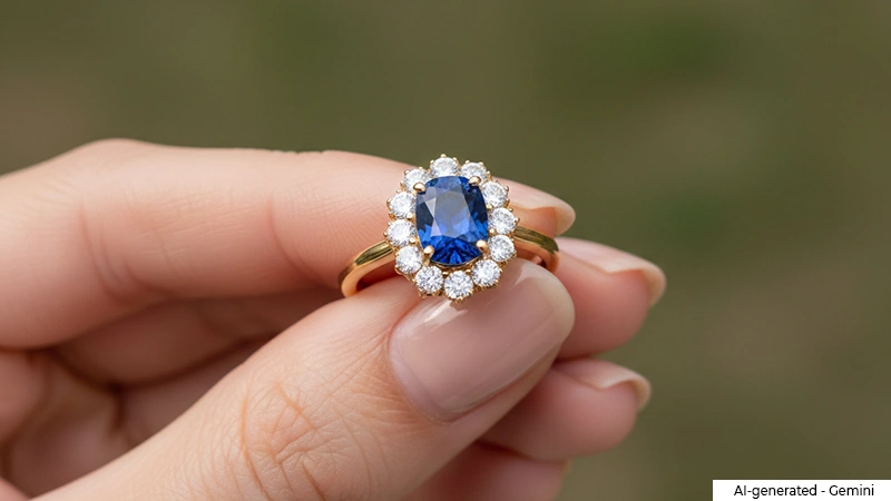 Inspired by the late Princess Diana’s blue sapphire ring, this ring pairs passion with opulence. Its halo of diamonds adds a royal layer that every modern muse adores.